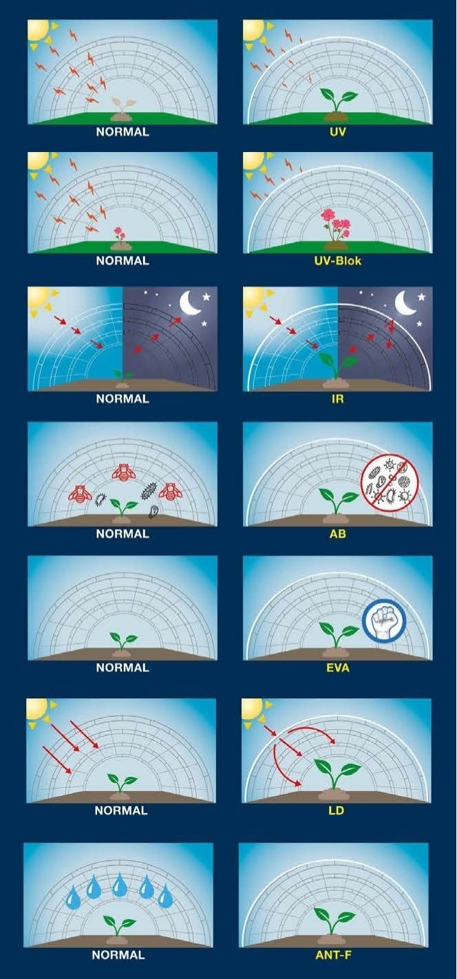 - ANTIFOG — добавка «антифог», предотвращающая образование конденсата на внутренней стороне плёнки. Если точнее, то роса фактически стекает вниз без образования капель, которые могут обладать «эффектом линзы», исключая образование ожогов у растений;